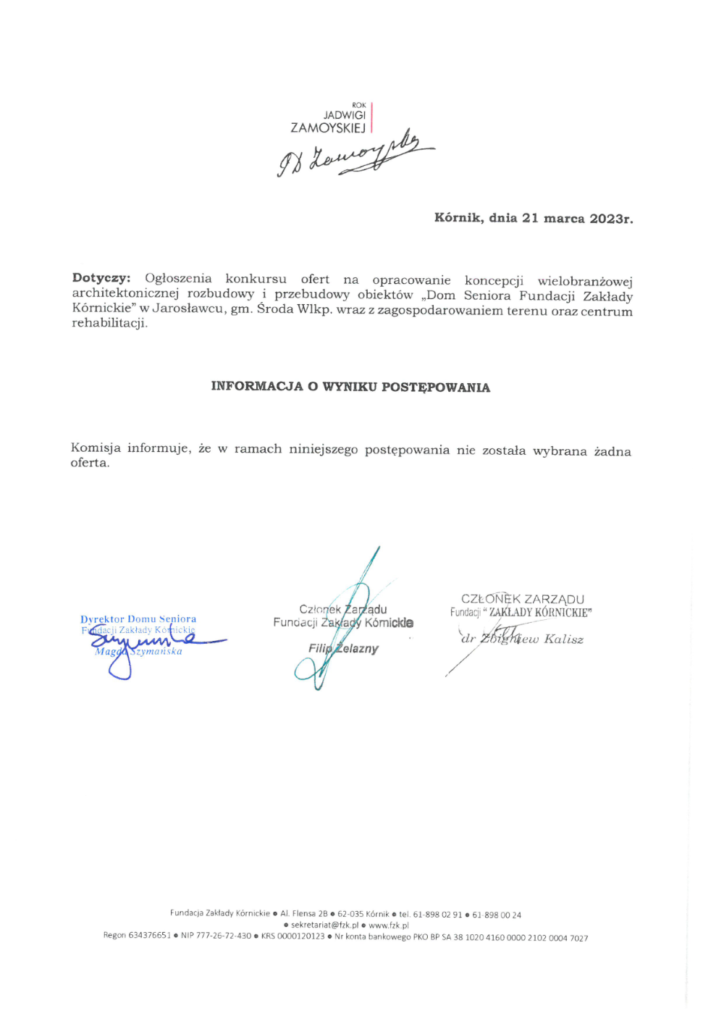 Informacja o wyniku konkursu ofert na wykonanie projektu rozbudowy Domu Seniora Fundacji Zakłady Kórnickie w Jarosławcu.